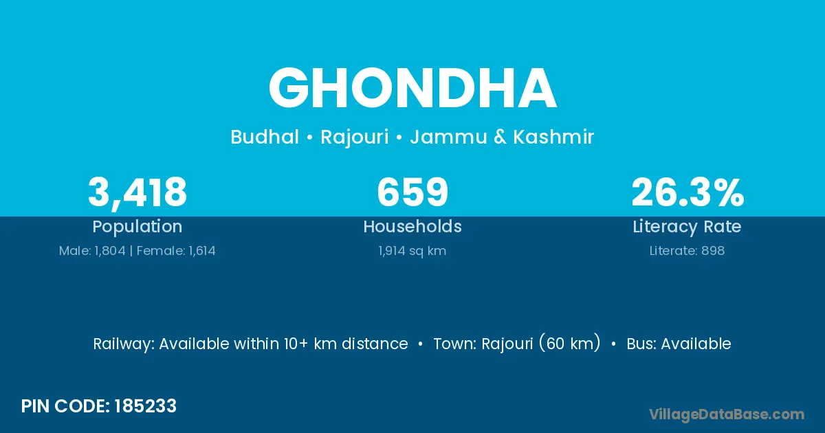 Rajouri (60 km) is the nearest town to Ghondha village for major economic activities and is located approximately 60 km away.