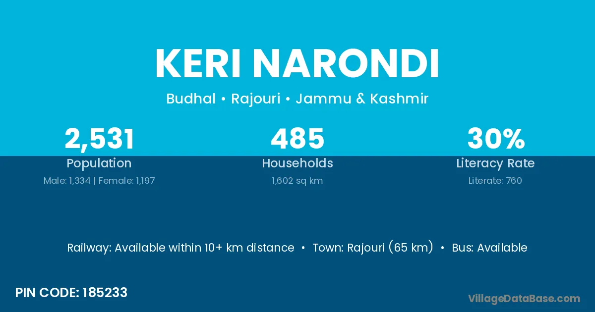 Rajouri (65 km) is the nearest town to Keri Narondi village for major economic activities and is located approximately 65 km away.