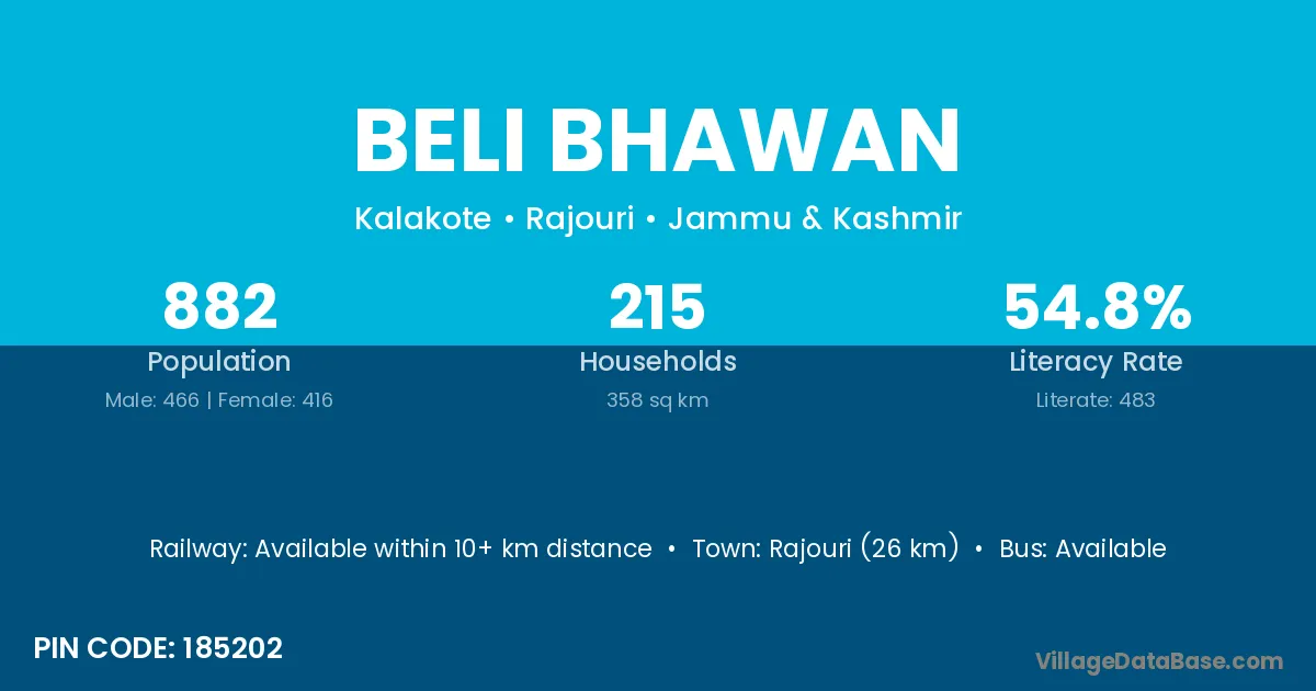 Rajouri (26 km) is the nearest town to Beli Bhawan village for major economic activities and is located approximately 26 km away.
