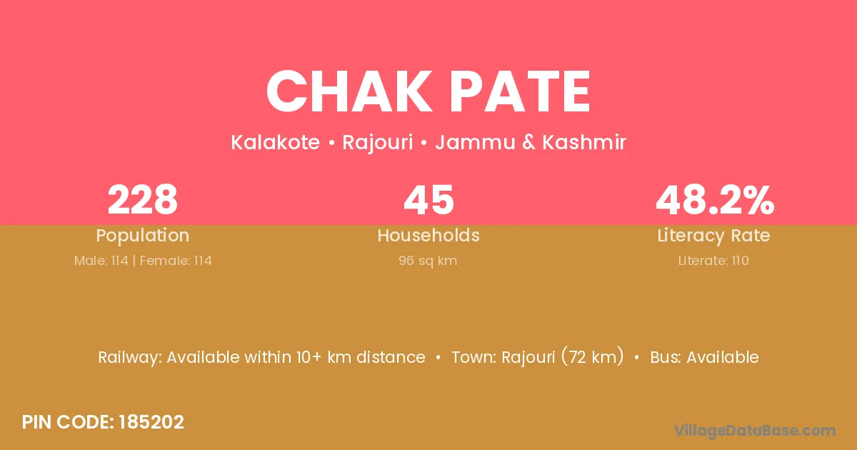 Chak Pate village has a total population of 228 people, of which 114 are males and 114 are females.