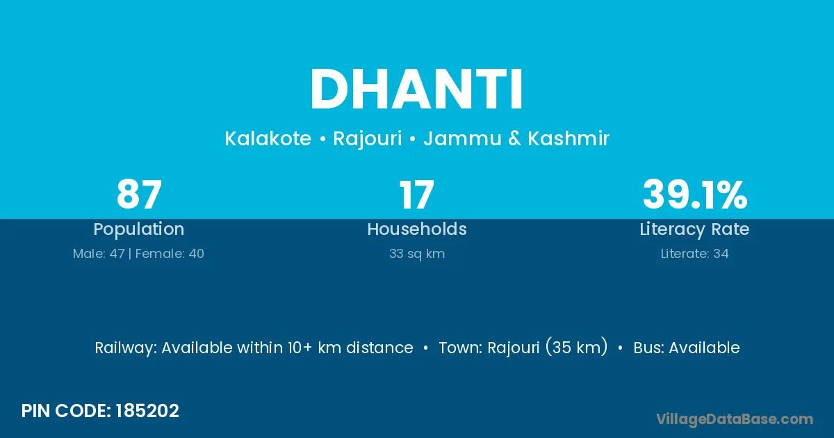 Rajouri (35 km) is the nearest town to Dhanti village for major economic activities and is located approximately 35 km away.