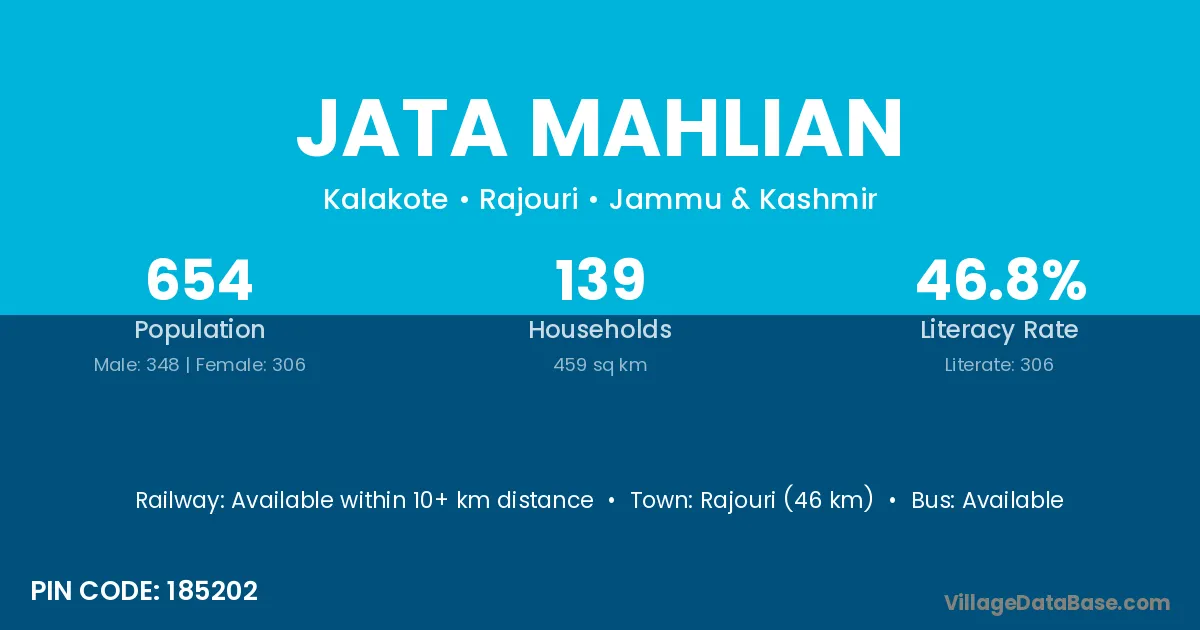 Rajouri (46 km) is the nearest town to Jata Mahlian village for major economic activities and is located approximately 46 km away.