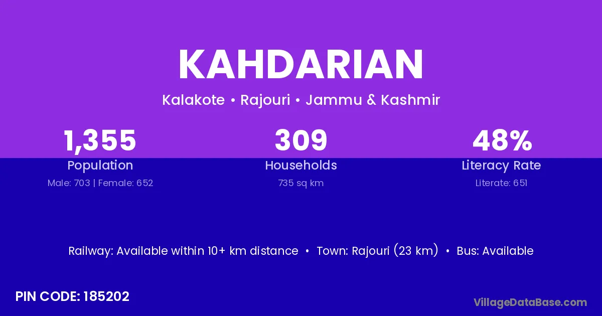 Rajouri (23 km) is the nearest town to Kahdarian village for major economic activities and is located approximately 23 km away.
