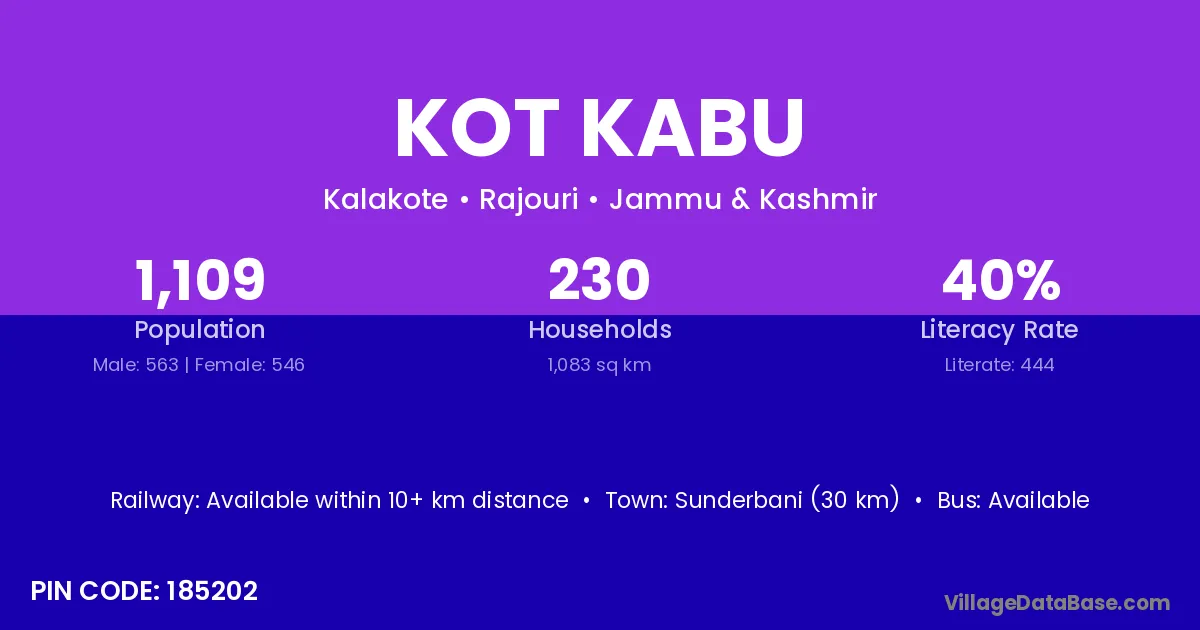 Sunderbani (30 km) is the nearest town to Kot Kabu village for major economic activities and is located approximately 30 km away.