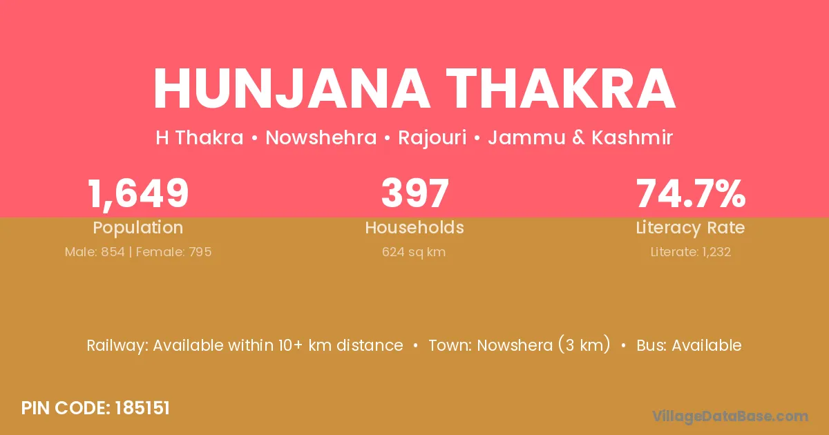 Nowshera (3 km) is the nearest town to Hunjana Thakra village for major economic activities and is located approximately 3 km away.