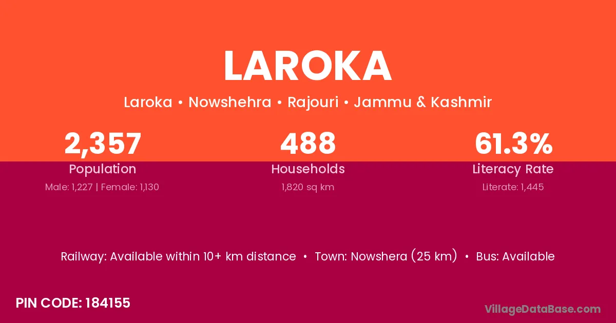 Laroka village has a total population of 2,357 people, of which 1,227 are males and 1,130 are females.