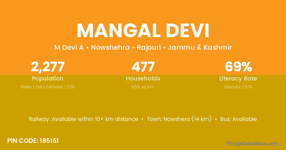 Mangal Devi village has a total population of 2,277 people, of which 1,198 are males and 1,079 are females.