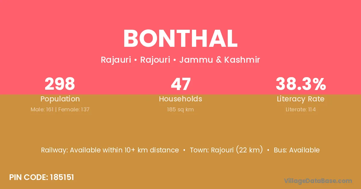 Rajouri (22 km) is the nearest town to Bonthal village for major economic activities and is located approximately 22 km away.