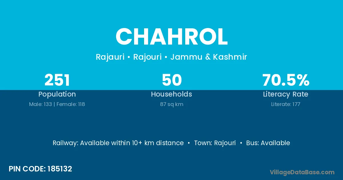 According to Census 2011 information, the village code of Chahrol village is 185132.