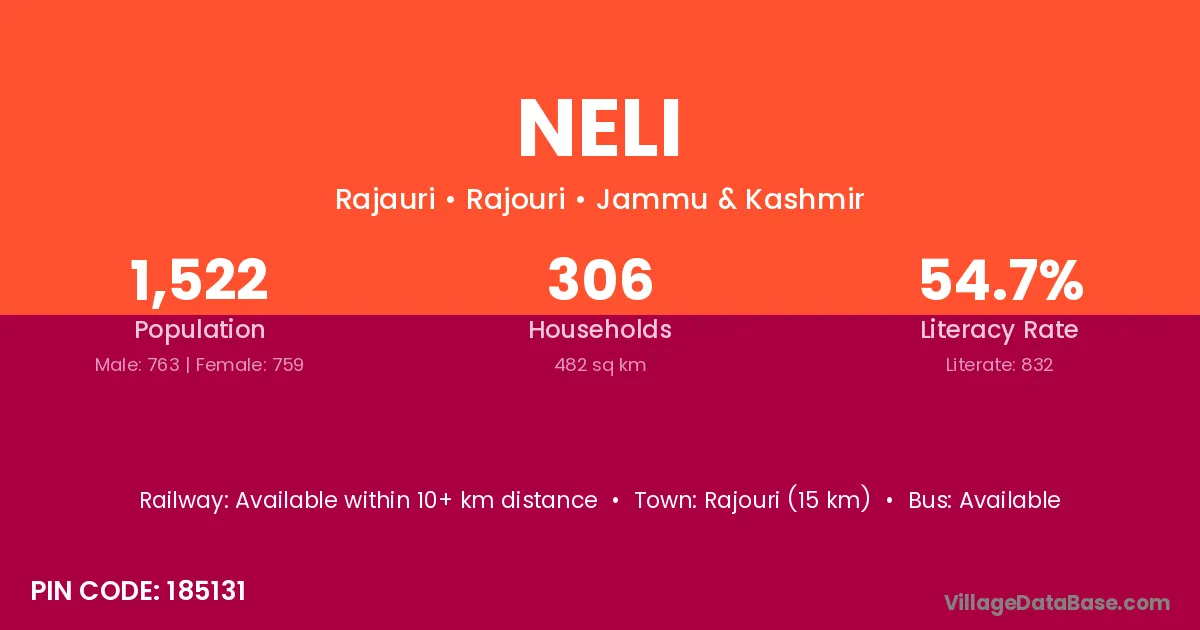 Rajouri (15 km) is the nearest town to Neli village for major economic activities and is located approximately 15 km away.