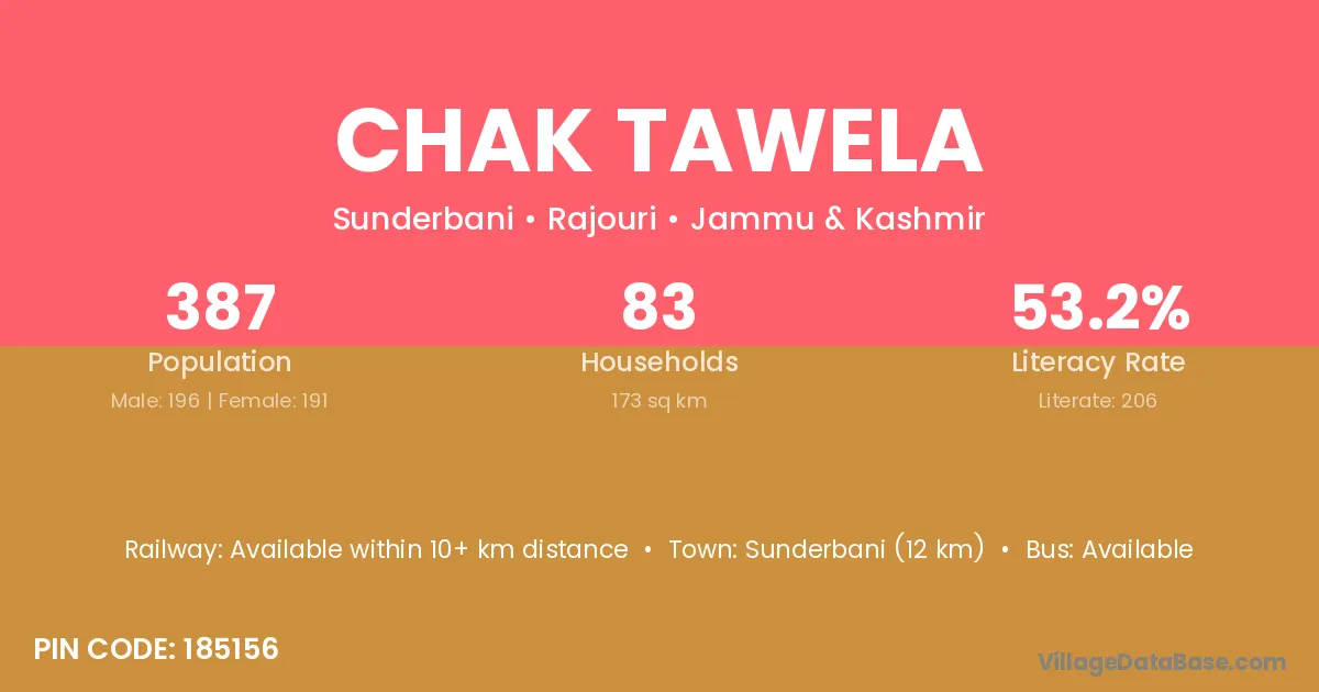 Sunderbani (12 km) is the nearest town to Chak Tawela village for major economic activities and is located approximately 12 km away.