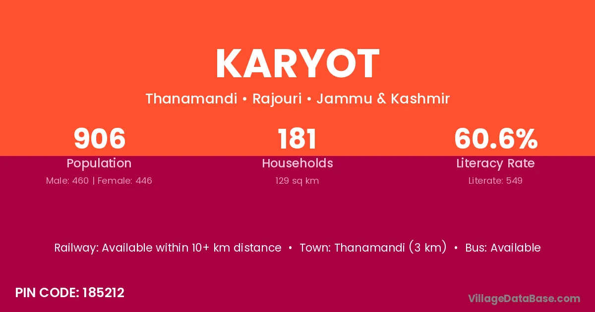Thanamandi (3 km) is the nearest town to Karyot village for major economic activities and is located approximately 3 km away.