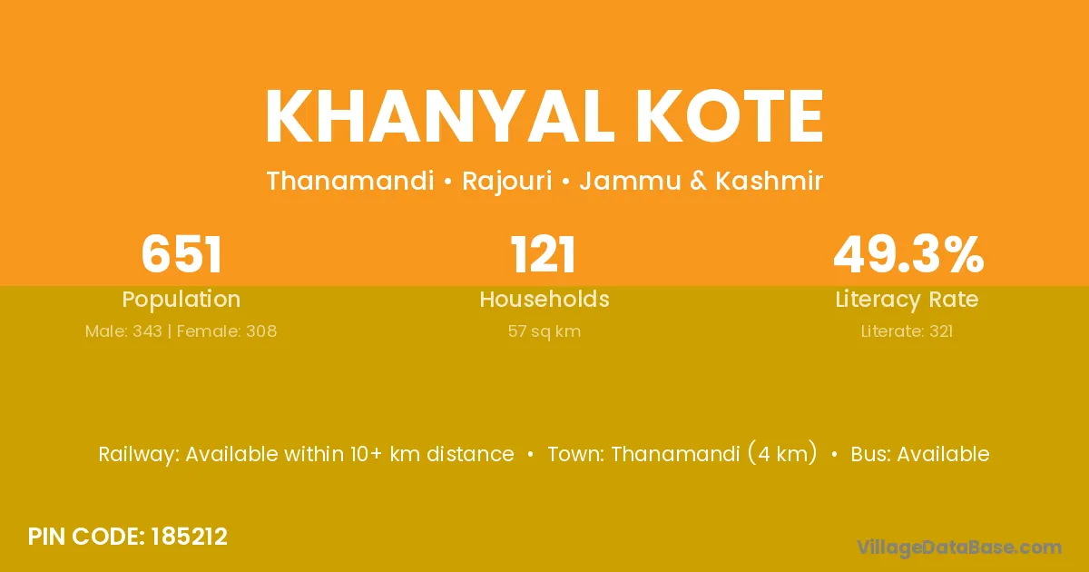 Khanyal Kote village has a total population of 651 people, of which 343 are males and 308 are females.