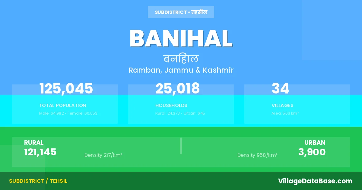 According to the 2011 census The total area of Banihal Tehsil is 563 km², with a population of 125045 people. The population density is 222 inhabitants per square kilometre, and there are approximately 25018 houses in the sub district.