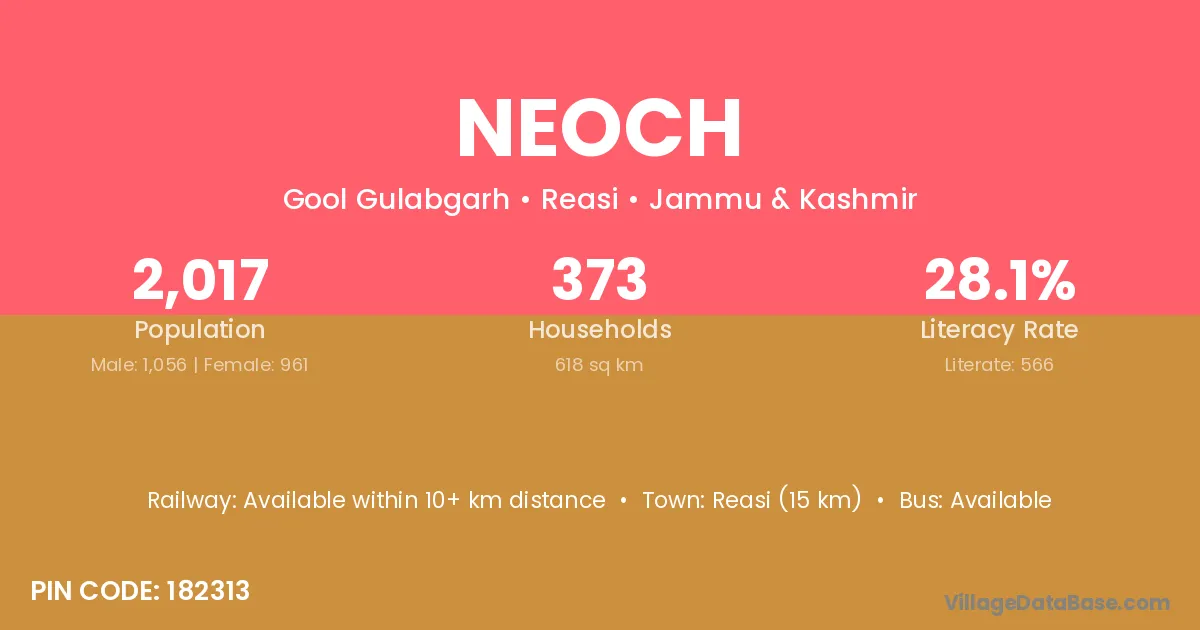 Reasi (15 km) is the nearest town to Neoch village for major economic activities and is located approximately 15 km away.