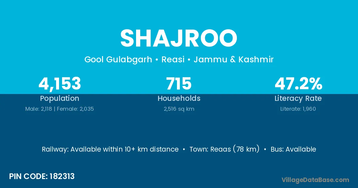 Reaas (78 km) is the nearest town to Shajroo village for major economic activities and is located approximately 78 km away.