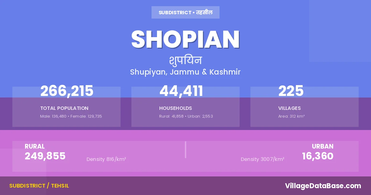 According to the 2011 census The total area of Shopian Tehsil is 312 km², with a population of 266215 people. The population density is 854 inhabitants per square kilometre, and there are approximately 44411 houses in the sub district.