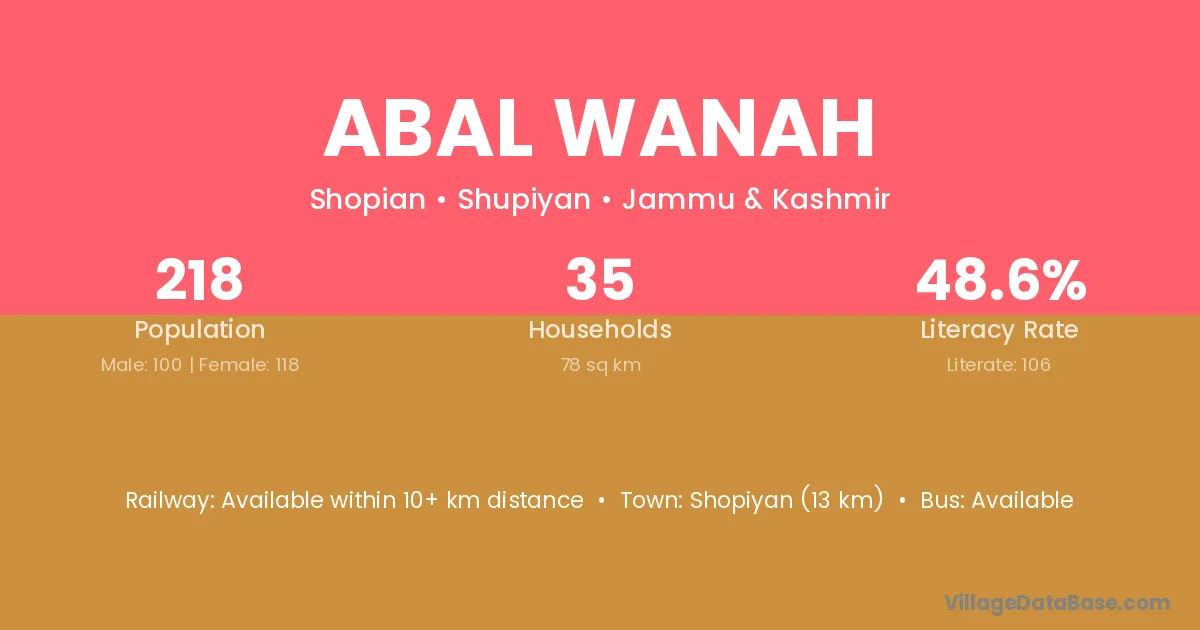 Shopiyan (13 km) is the nearest town to Abal Wanah village for major economic activities and is located approximately 13 km away.
