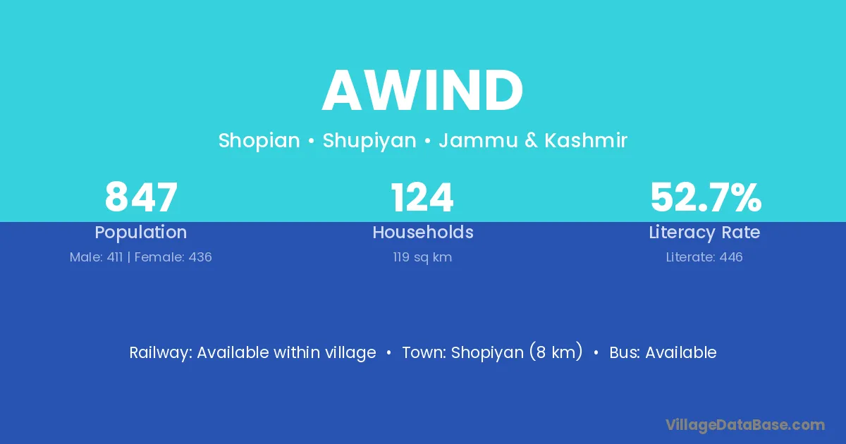 Shopiyan (8 km) is the nearest town to Awind village for major economic activities and is located approximately 8 km away.