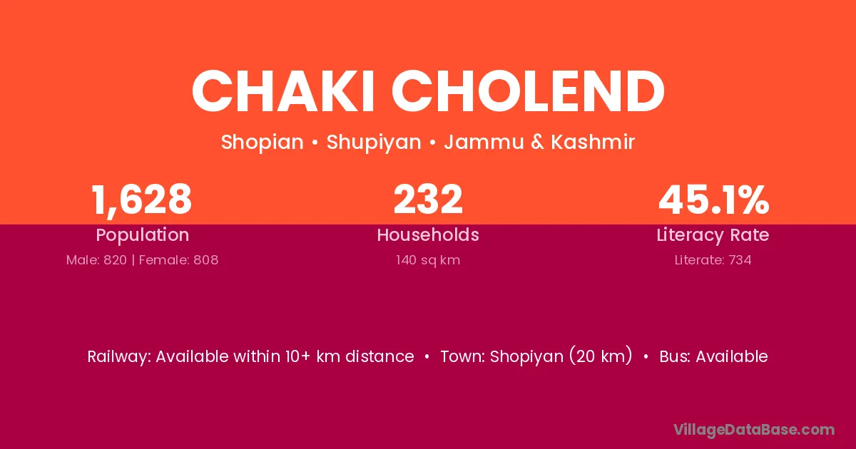 Shopiyan (20 km) is the nearest town to Chaki Cholend village for major economic activities and is located approximately 20 km away.