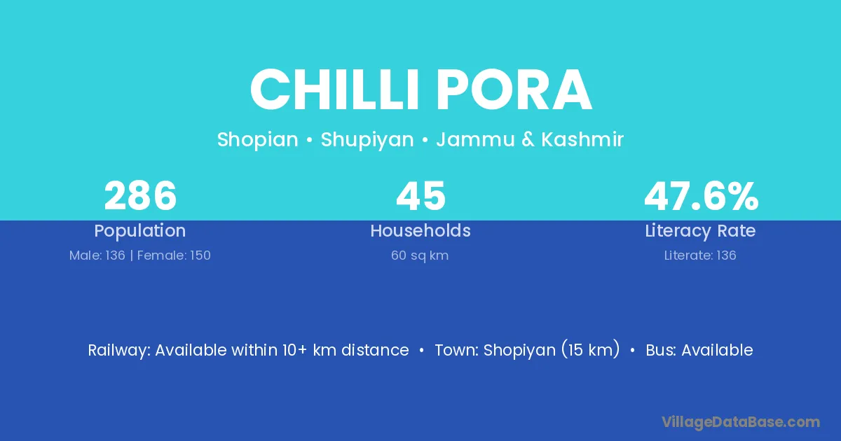 Shopiyan (15 km) is the nearest town to Chilli Pora village for major economic activities and is located approximately 15 km away.