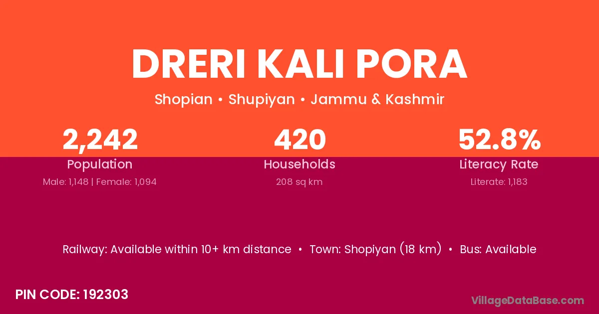 Shopiyan (18 km) is the nearest town to Dreri Kali Pora village for major economic activities and is located approximately 18 km away.