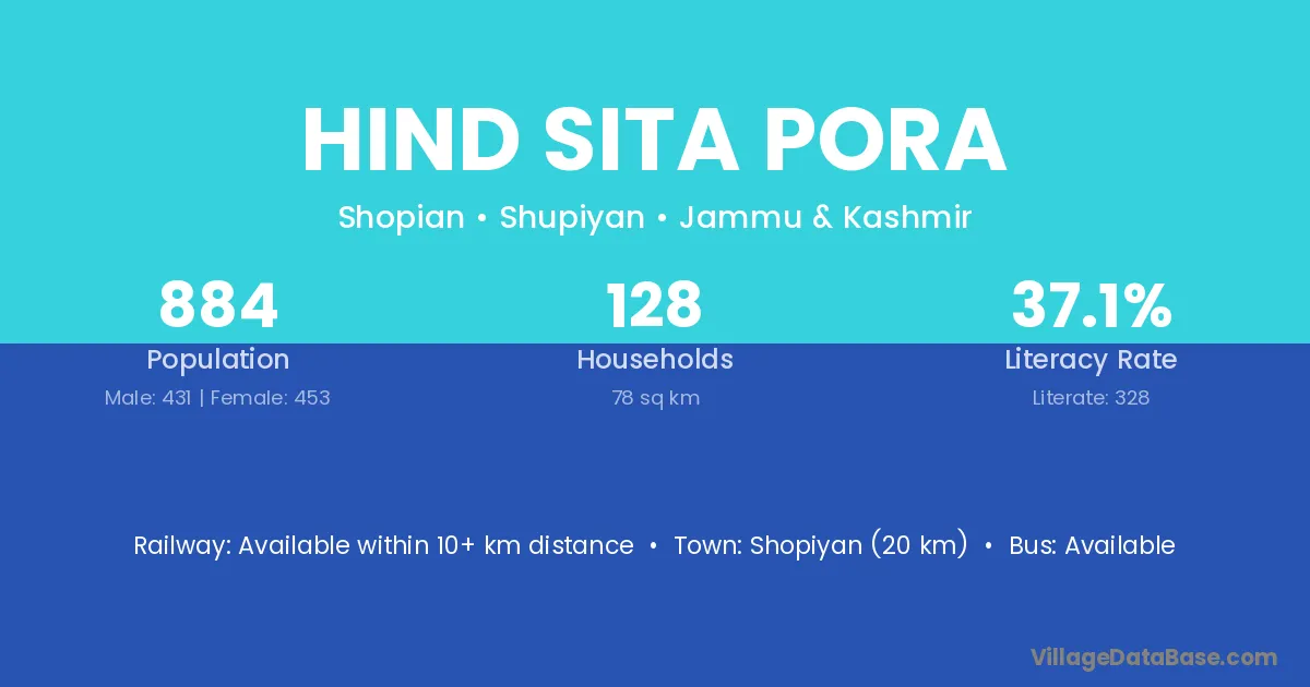 Shopiyan (20 km) is the nearest town to Hind Sita Pora village for major economic activities and is located approximately 20 km away.