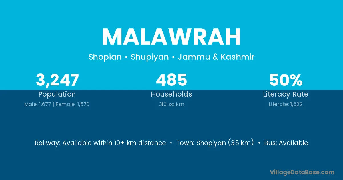 Shopiyan (35 km) is the nearest town to Malawrah village for major economic activities and is located approximately 35 km away.
