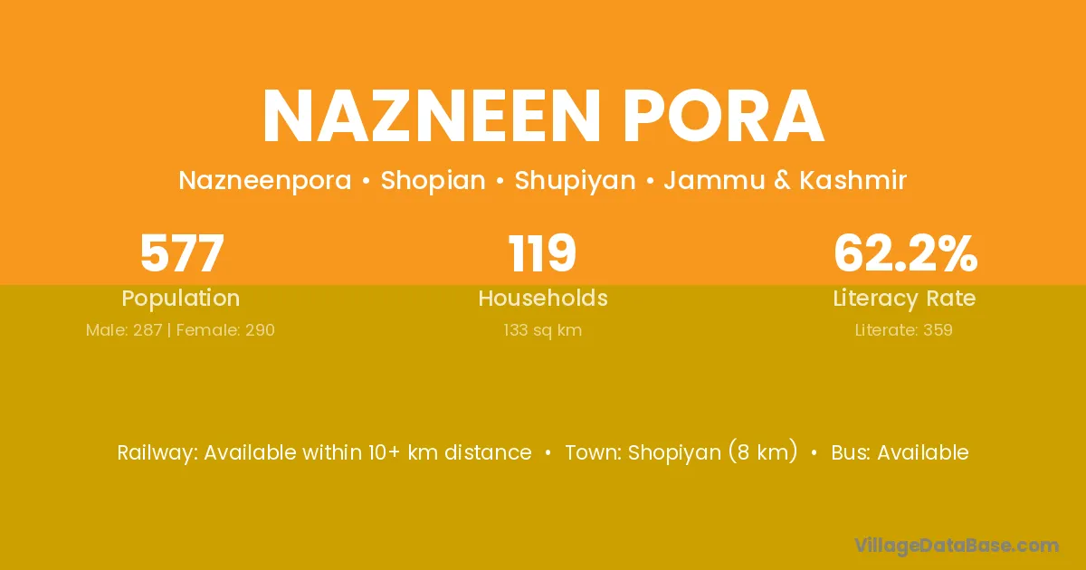Shopiyan (8 km) is the nearest town to Nazneen Pora village for major economic activities and is located approximately 8 km away.