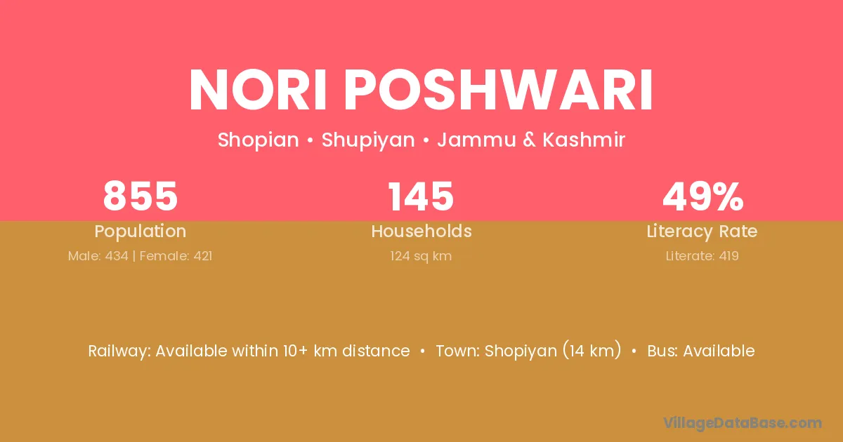 Shopiyan (14 km) is the nearest town to Nori Poshwari village for major economic activities and is located approximately 14 km away.