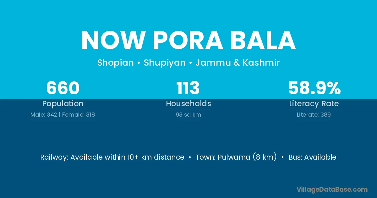 Pulwama (8 km) is the nearest town to Now Pora Bala village for major economic activities and is located approximately 8 km away.