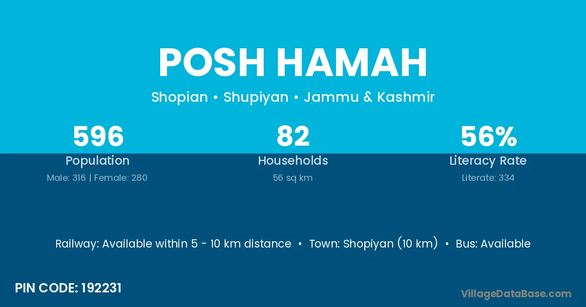 Shopiyan (10 km) is the nearest town to Posh Hamah village for major economic activities and is located approximately 10 km away.