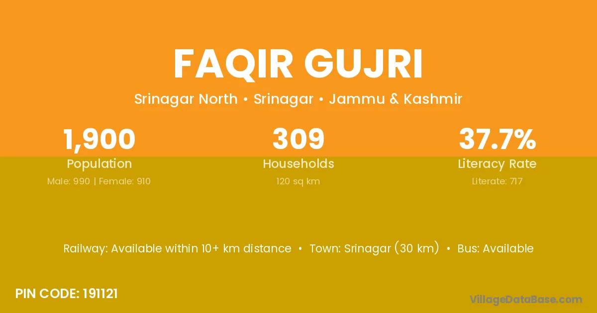 Srinagar (30 km) is the nearest town to Faqir Gujri village for major economic activities and is located approximately 30 km away.