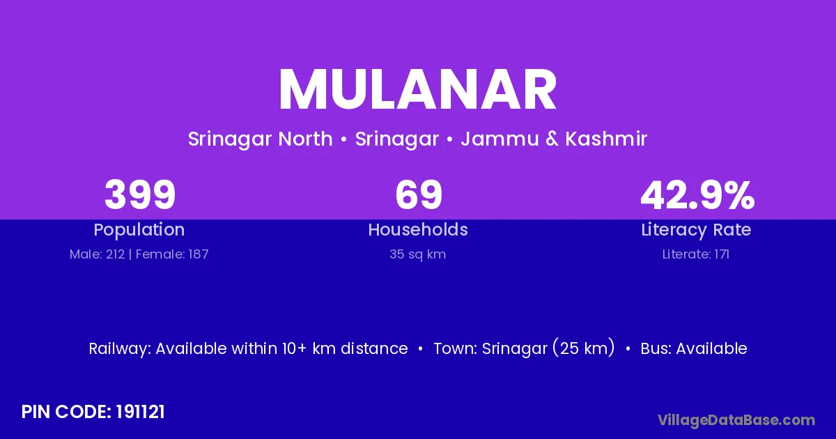 Srinagar (25 km) is the nearest town to Mulanar village for major economic activities and is located approximately 25 km away.