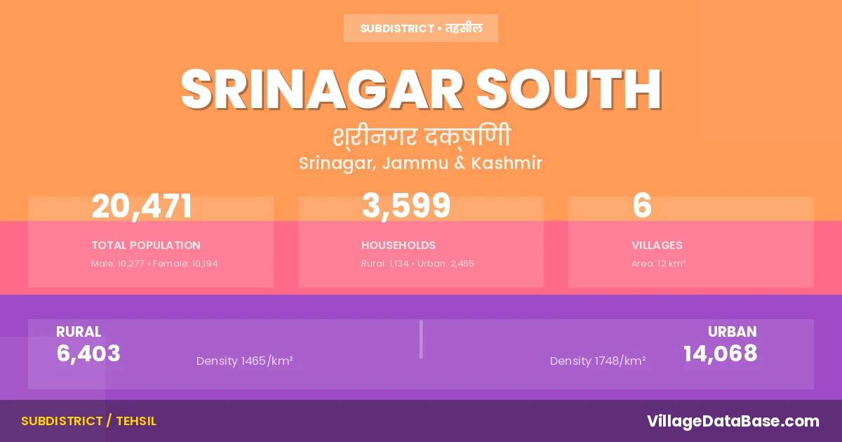 According to the 2011 census The total area of Srinagar South Tehsil is 12 km², with a population of 20471 people. The population density is 1,648 inhabitants per square kilometre, and there are approximately 3599 houses in the sub district.