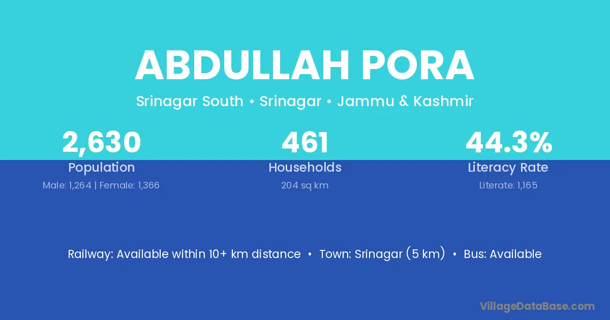 Srinagar (5 km) is the nearest town to Abdullah Pora village for major economic activities and is located approximately 5 km away.