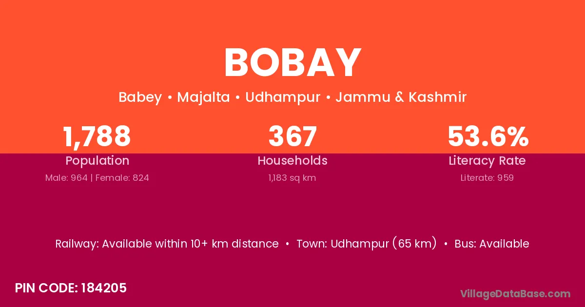 Udhampur (65 km) is the nearest town to Bobay village for major economic activities and is located approximately 65 km away.