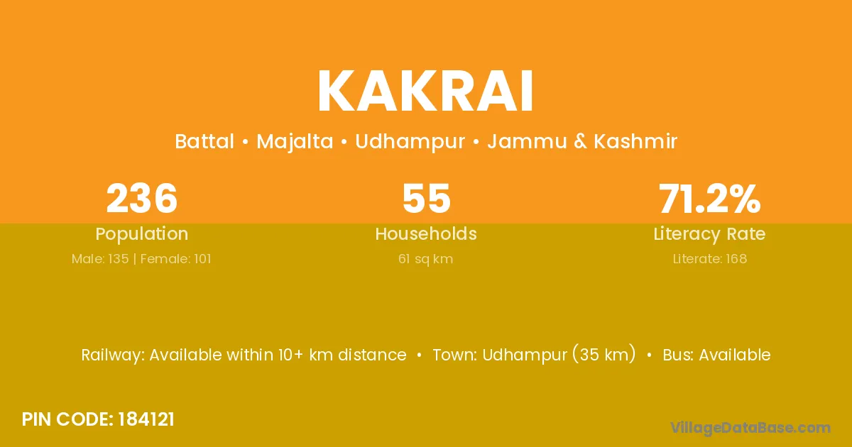 Udhampur (35 km) is the nearest town to Kakrai village for major economic activities and is located approximately 35 km away.