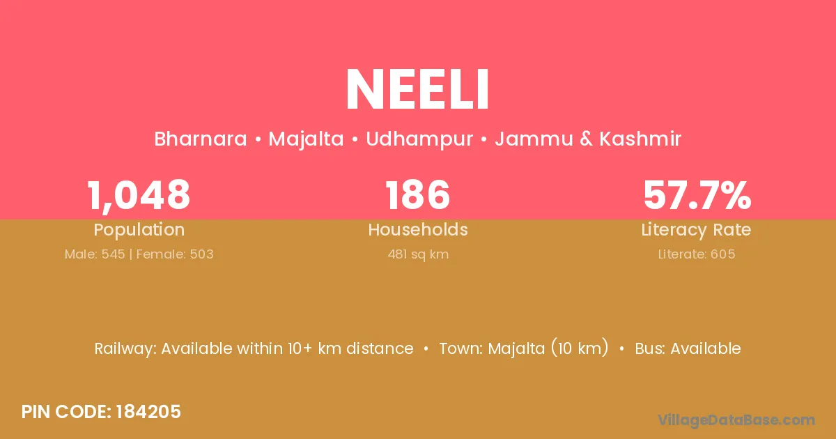 Neeli village has a total population of 1,048 people, of which 545 are males and 503 are females.