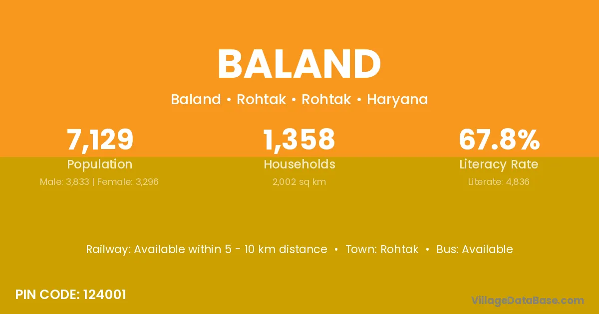 The literacy rate of Baland village is 50.38%. Male literacy stands at 57.63% and female literacy at 42.61%.