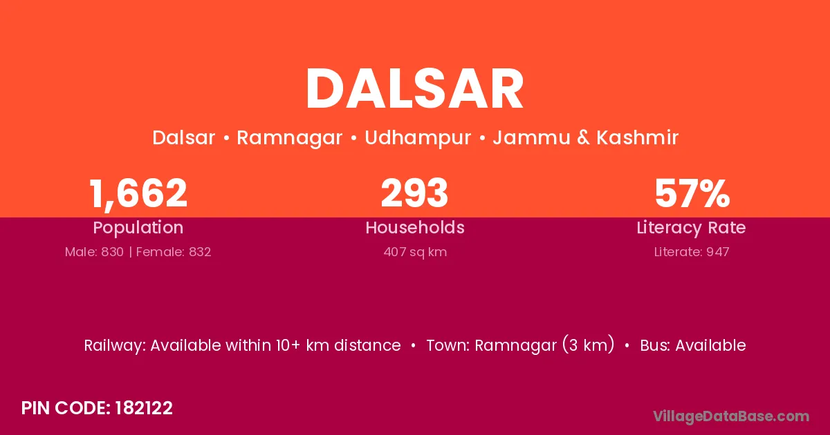 Ramnagar (3 km) is the nearest town to Dalsar village for major economic activities and is located approximately 3 km away.