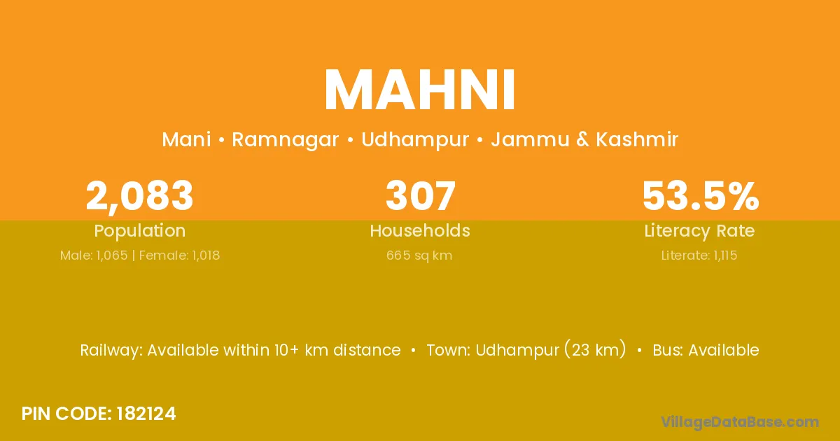 Udhampur (23 km) is the nearest town to Mahni village for major economic activities and is located approximately 23 km away.