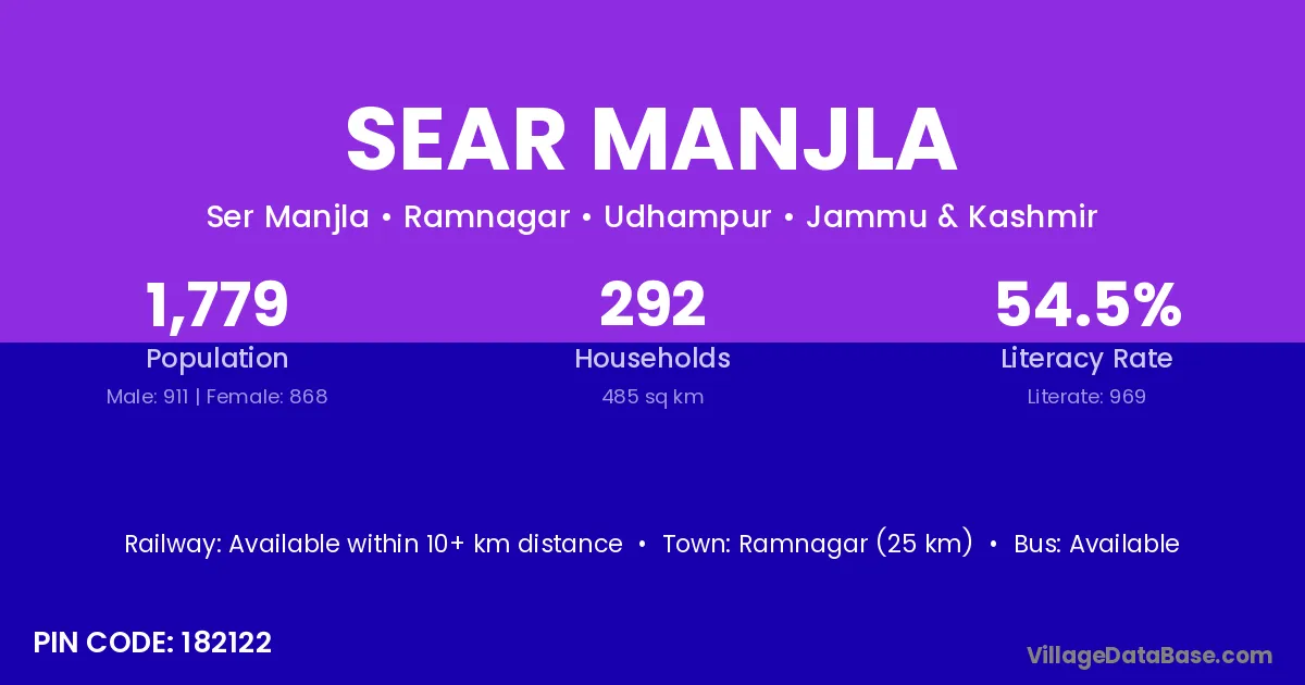 Ramnagar (25 km) is the nearest town to Sear Manjla village for major economic activities and is located approximately 25 km away.
