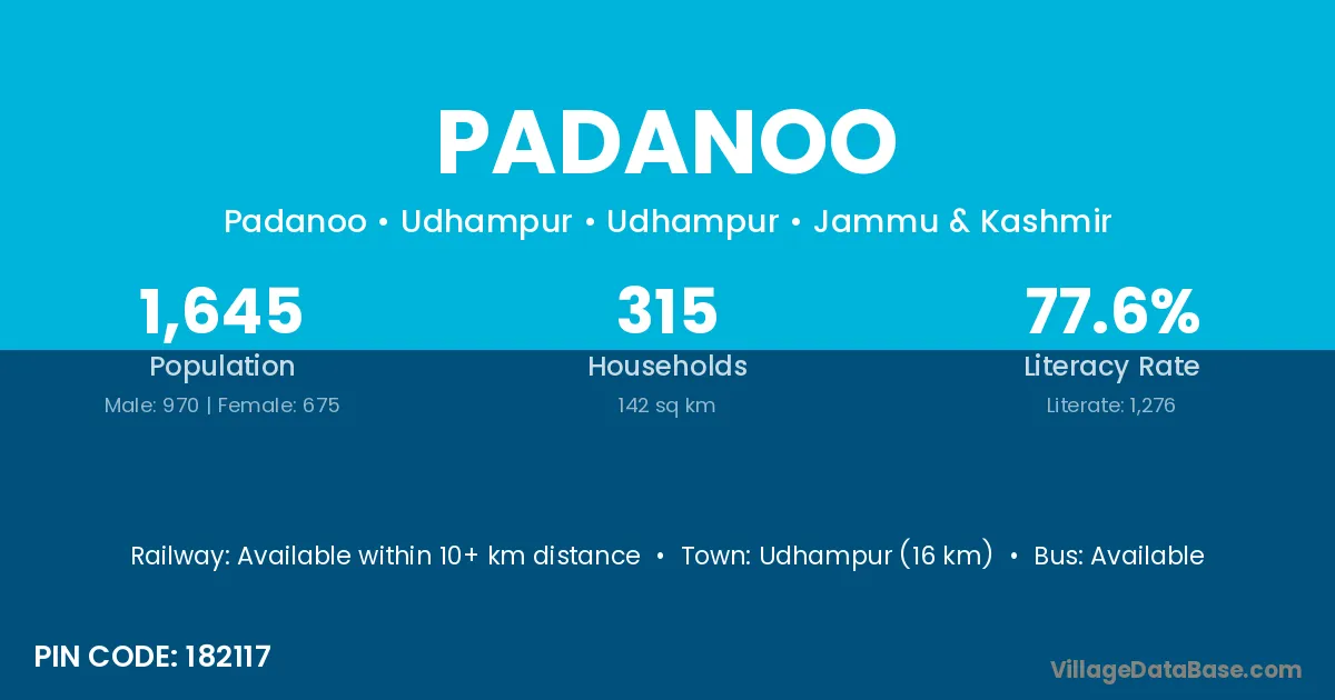 Udhampur (16 km) is the nearest town to Padanoo village for major economic activities and is located approximately 16 km away.