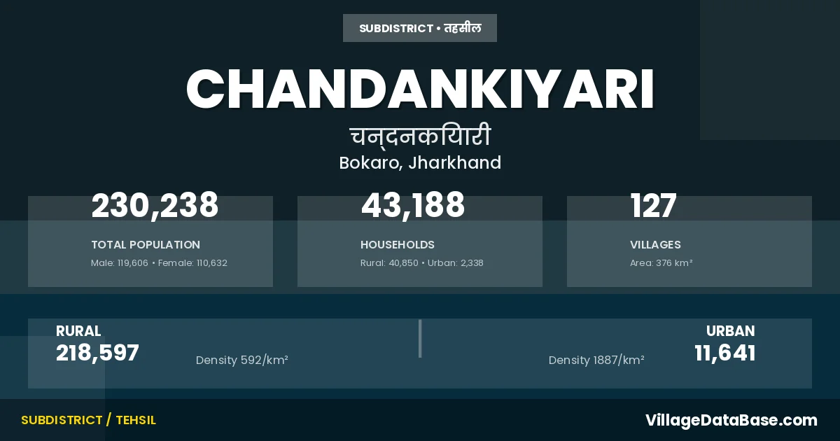 According to the 2011 census The total area of Chandankiyari Subdivision is 376 km², with a population of 230238 people. The population density is 613 inhabitants per square kilometre, and there are approximately 43188 houses in the sub district.
