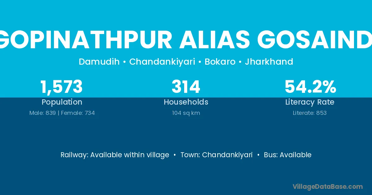 Gopinathpur Alias Gosaindi village has a total population of 1,573 people, of which 839 are males and 734 are females.