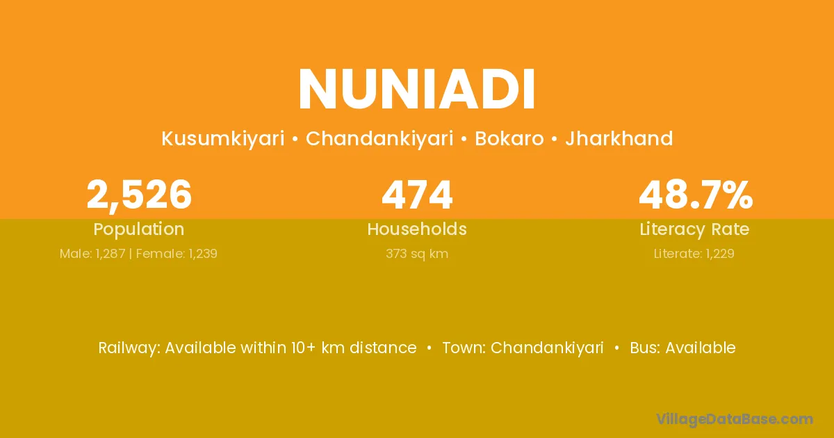 Nuniadi village has a total population of 2,526 people, of which 1,287 are males and 1,239 are females.