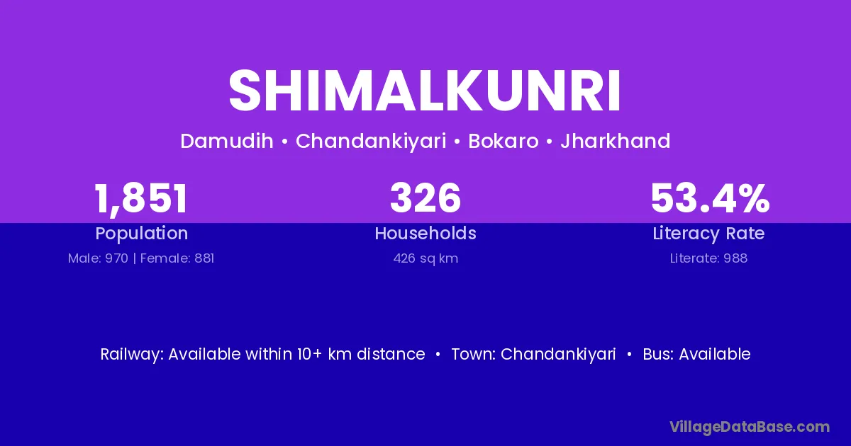 Shimalkunri village has a total population of 1,851 people, of which 970 are males and 881 are females.