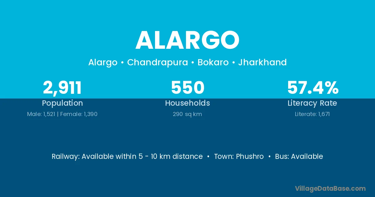 The literacy rate of Alargo village is 57.40%. Male literacy stands at 69.36% and female literacy at 44.32%.