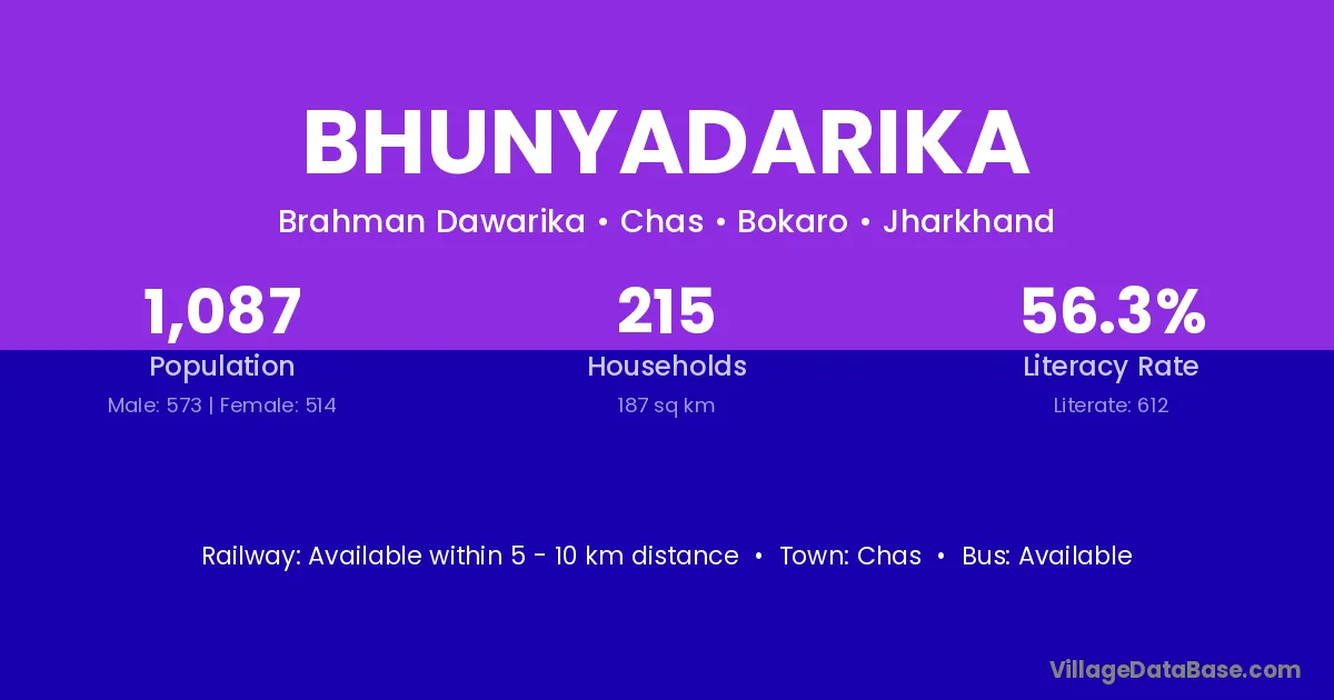 Bhunyadarika village has a total population of 1,087 people, of which 573 are males and 514 are females.